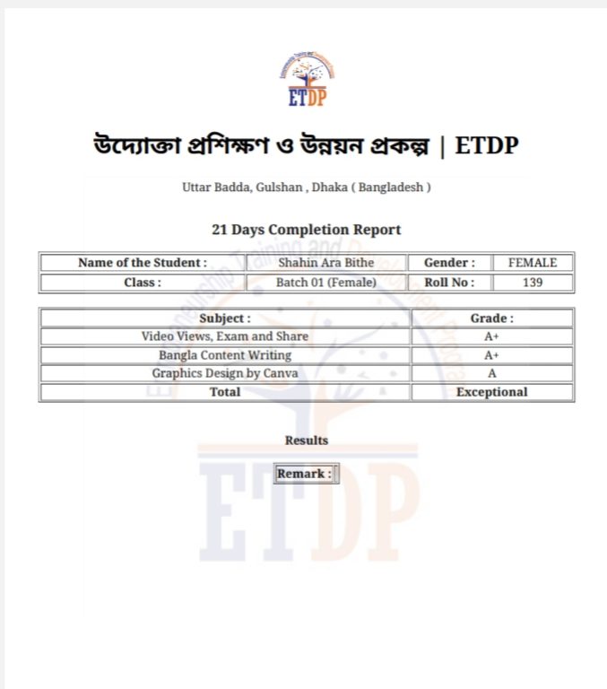আমি একজন ফুল টাইম ফ্রিল্যান্সার। আমি EDTP উদ্যোক্তা প্রশিক্ষণ ও উন্নয়ন প্রকল্পের আওতায় একটি সেশন কমপ্লিট করেছি। আমি আমার কাজ সর্বাত্মক গুরুত্ব সহকারে সময়মতো শেষ করি।আমি ক্যানভা দিয়ে গ্রাফিক্স ও ফিচার্ট ইমেজ এর কাজ গুলো করতে পারি,বাংলা কনন্টেন লিখতে পারি, কাজের ক্ষেত্রে আমি কখনো কাউকে নিরাশ করব না। ইন-শাহ-আল্লাহ।